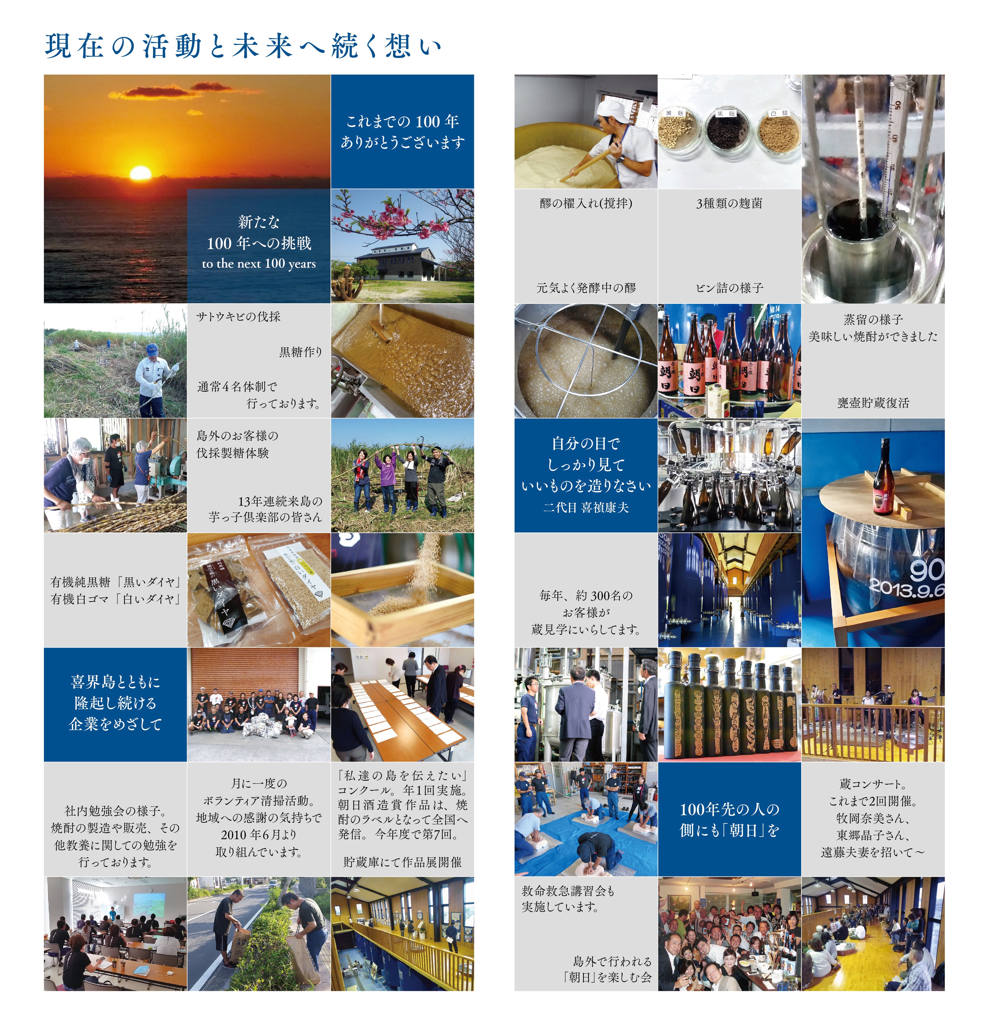 この節目を契機といたしまして、新たな100年は、焼酎蔵として私たちの成すべきことを考え、未来を見据えた企業として、これまで以上に「喜界島」にこだわり、より安全安心な「ものづくり」に挑戦し続ける会社でありたいと考えております。